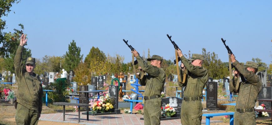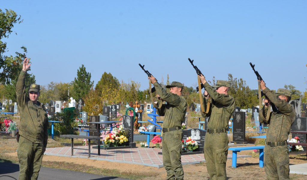 Под звуки прощального салюта присутствующие почтили память погибшего воина и, как полагается по традиции, каждый бросил горсть земли в могилу.