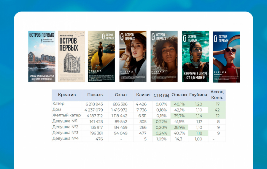 Лучше всего сработали персонализированные образы, тогда как объектная реклама («катер/дом») дала больший охват (из-за длительного размещения), но меньшую вовлеченность.