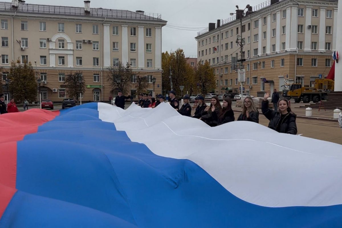 В Калуге активисты МГЕР развернули флаг России на Театральной площади.