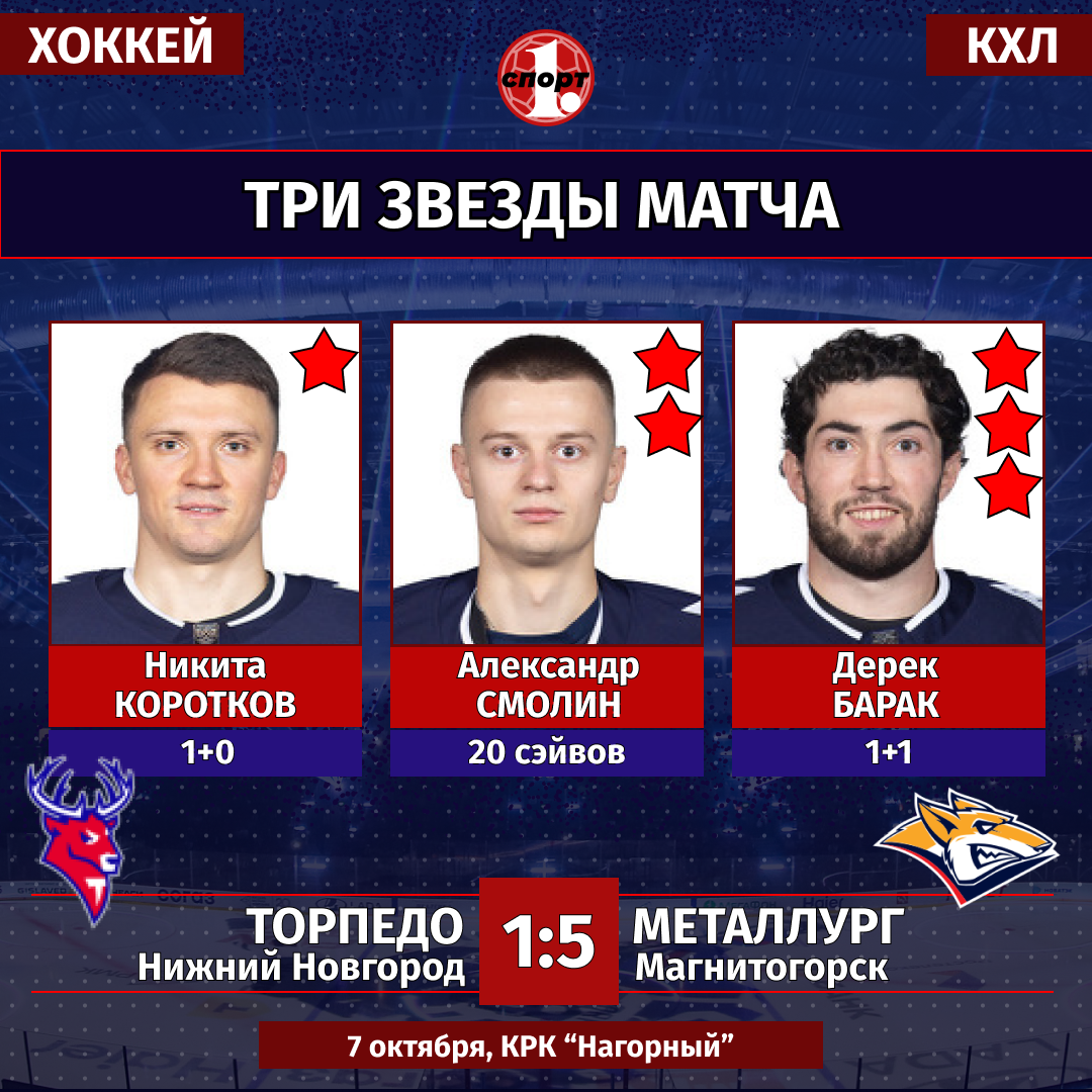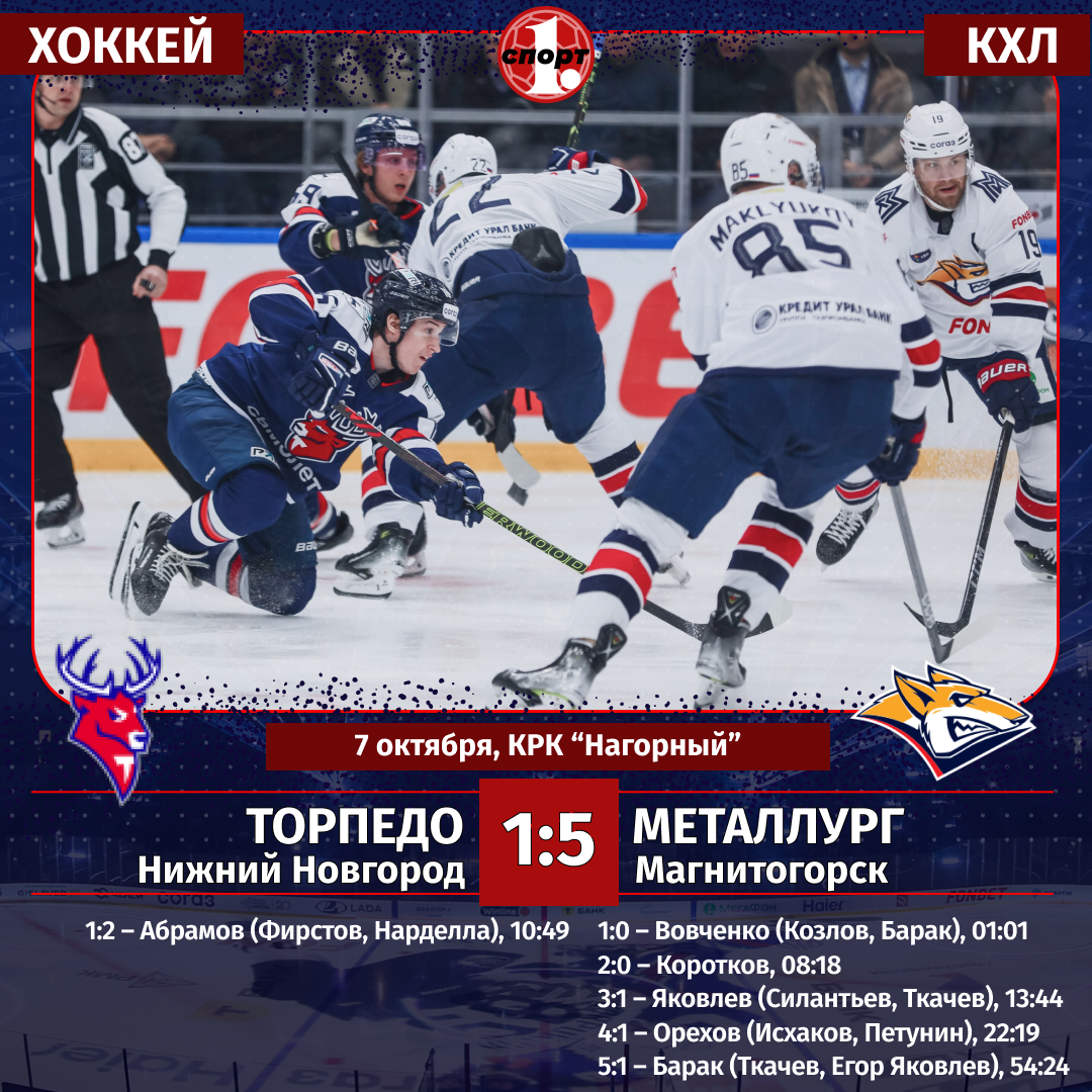 Хоккей. Сезон-2025/2026. Чемпионат КХЛ. 7 октября «Торпедо» (Нижний Новгород) — «Металлург» (Магнитогорск) — 1:5 (1:3, 0:1, 0:1).