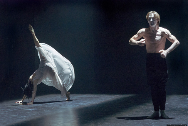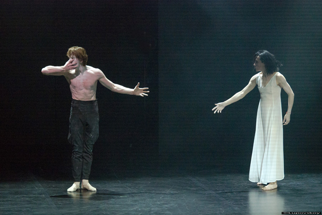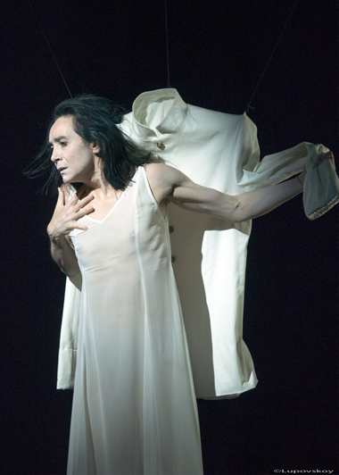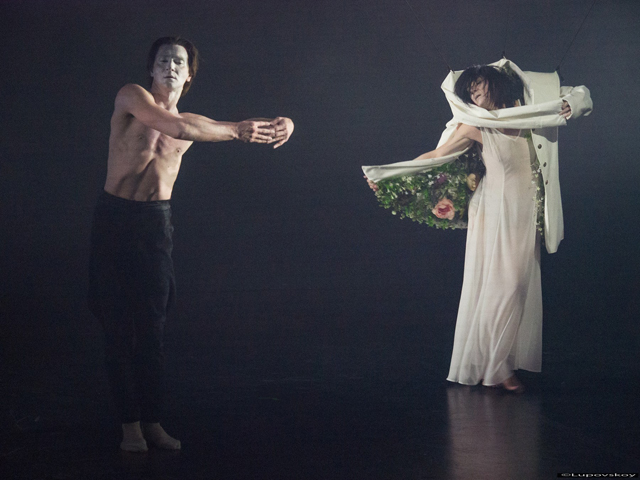 Режиссерские кульминации находят продолжение в кульминации хореографической, где двоемирие Карениной высвечивается в иной плоскости. В момент разлада у каждого из героев свое соло в луче света. Вронский спиной к зрителю воспроизводит нервные рубленые движения, они напоминают жесты тореадора из балета «Кармен-сюита». Он желает одного — выжить в этом безумии. Лицом к зрителю в то же время мечется, переливается, рвется бледная Каренина, и в белом рубище она предстает духом, да-да, вилисой. Конечно, не из романтического пуантового балета, а младшей сестрой той, что во втором акте «Жизели» Матса Эка оказалась в психиатрической больнице. Тема безумия, безусловно, отражена в новой танцевальной версии «Анны Карениной». Вот, думается, откуда в танц-пьесе с изящным названием появилась кинематографическая находка с перегородкой — можно вспомнить расчлененные части тела на декорациях у Матса Эка, а если знать, что Павленко — поклонница фильмов Тарковского, то это тоже многое проясняет.