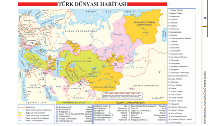 В новых турецких учебниках на первых же страницах Башкирия и Татарстан обозначены на картах как часть тюркского мира. Скриншот с сайта aokul.gov.tr