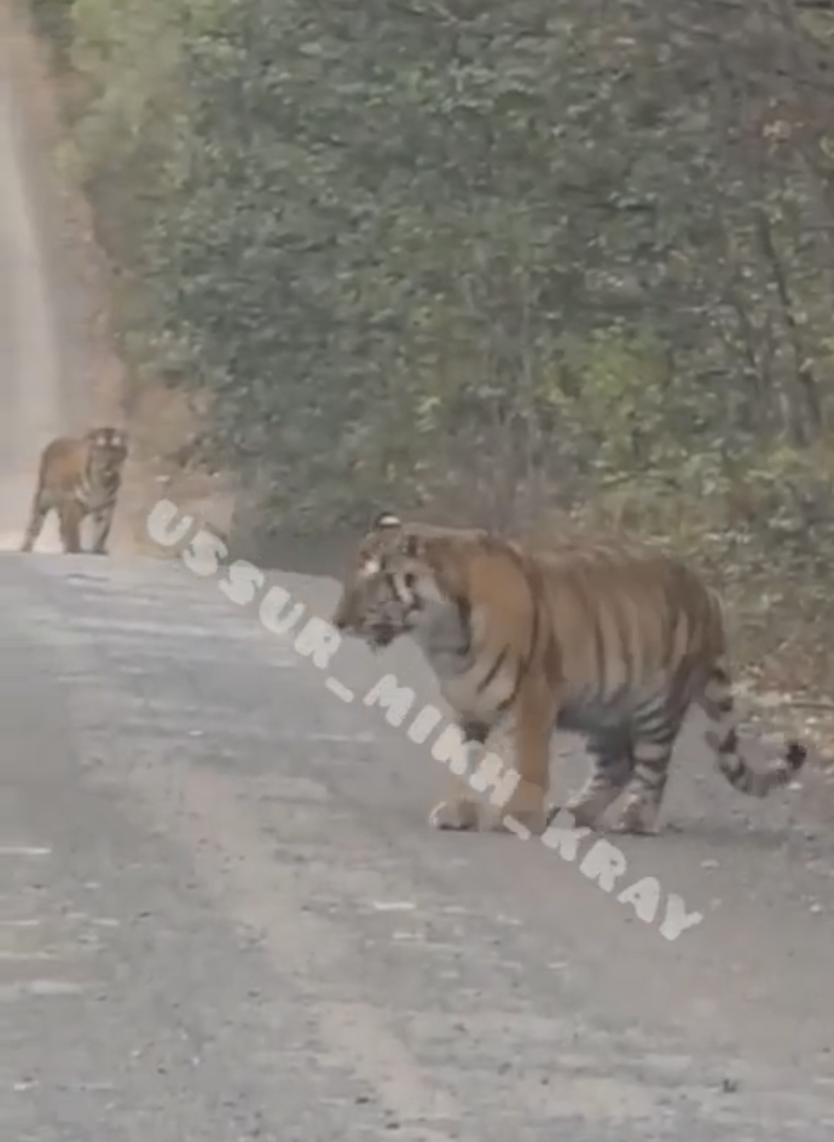 На кадрах, опубликованных в ТГ-канале ussur_mikh_kray, видно, как полосатая мама-кошка спокойно идет по своим делам, а за ней следует ее тигренок. Встретить такое в дикой природе считается огромной удачей.