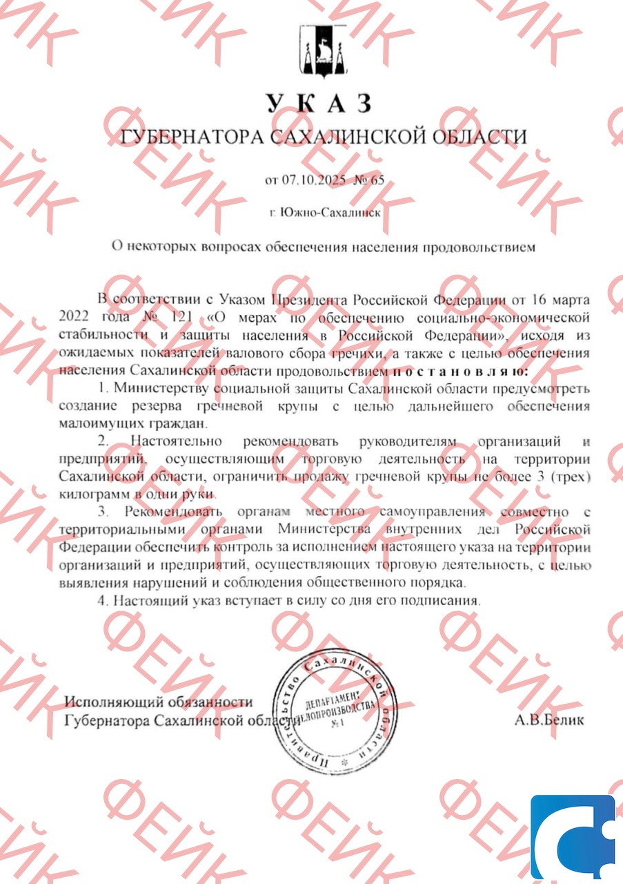 Фейковая бумага выполнена в стиле Указа Губернатора островного региона. Текстом вымышленного документа региональному Министерству социальной защиты Сахалинской области предписано сформировать продовольственный запас гречки и запретить реализацию более трех килограммов этой крупы в одни руки.