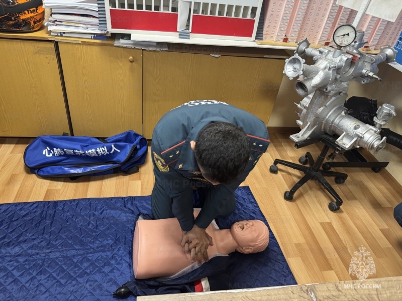 Кроме того, личный состав с помощью манекена по очереди отрабатывали технику сердечно-легочной реанимации.