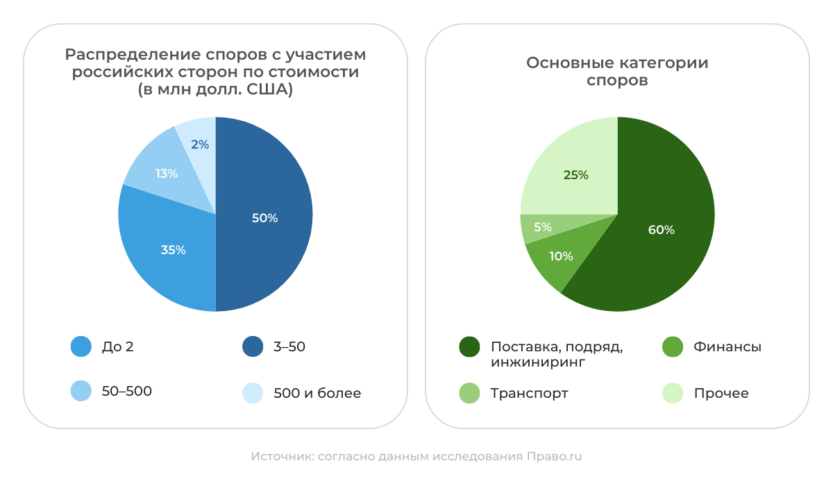Одновременно развиваются российские арбитражные центры. Например, в Арбитражном центре при РСПП количество международных споров выросло больше чем в 1,5 раза: в 2022 году их было 10, а в 2024-м — уже 16. Стало больше иностранных юрисдикций и в Российском арбитражном центре: в 2022 году их было девять, а в 2024 — 11. В свою очередь, МКАС при ТПП РФ, согласно данным исследования Право.ru, занял второе место по количеству споров с участием российских сторон и уступил только Лондонскому суду международного арбитража (LCIA).