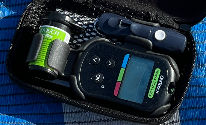 Ниже показан глюкометр OneTouch Select Plus Flex, предназначенный для измерения уровня сахара в крови. В набор входят само устройство с экраном, контейнер с тест-полосками OneTouch Select Plus и ланцетное устройство для прокола пальца. Такой комплект используется для самостоятельного контроля глюкозы у людей с диабетом.