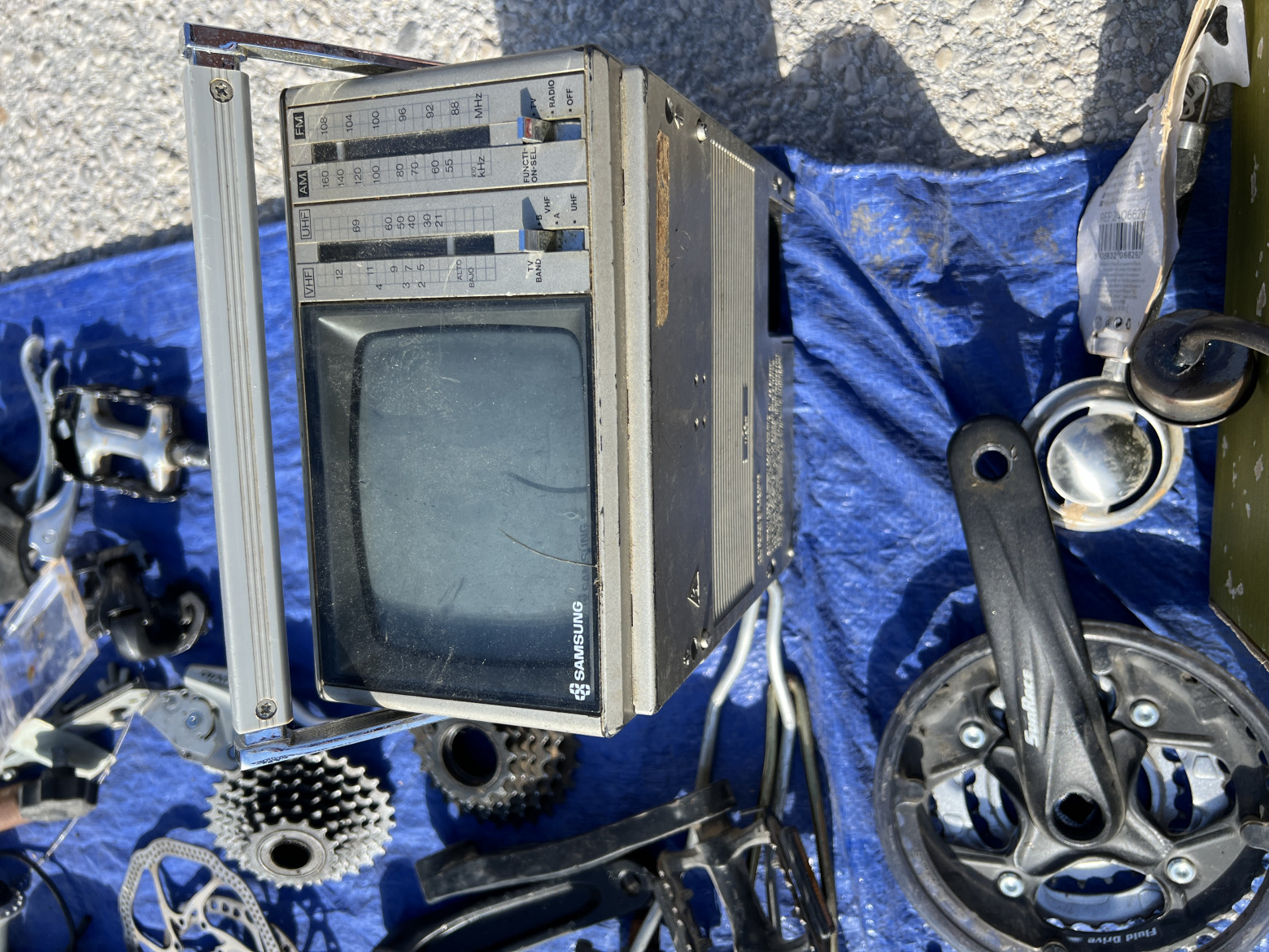 На фото портативный телевизор Samsung, выпущенный примерно в конце 1970-х — начале 1980-х годов. Это компактная чёрно-белая модель с небольшим кинескопом и ручкой для переноски, совмещенная с радиоприемником AM/FM. Устройство имело механические ползунковые регуляторы для настройки диапазонов VHF/UHF, громкости и радиостанций. Подобные телевизоры часто использовались дома, в гаражах или автомобилях и могли работать как от сети, так и от батарей.