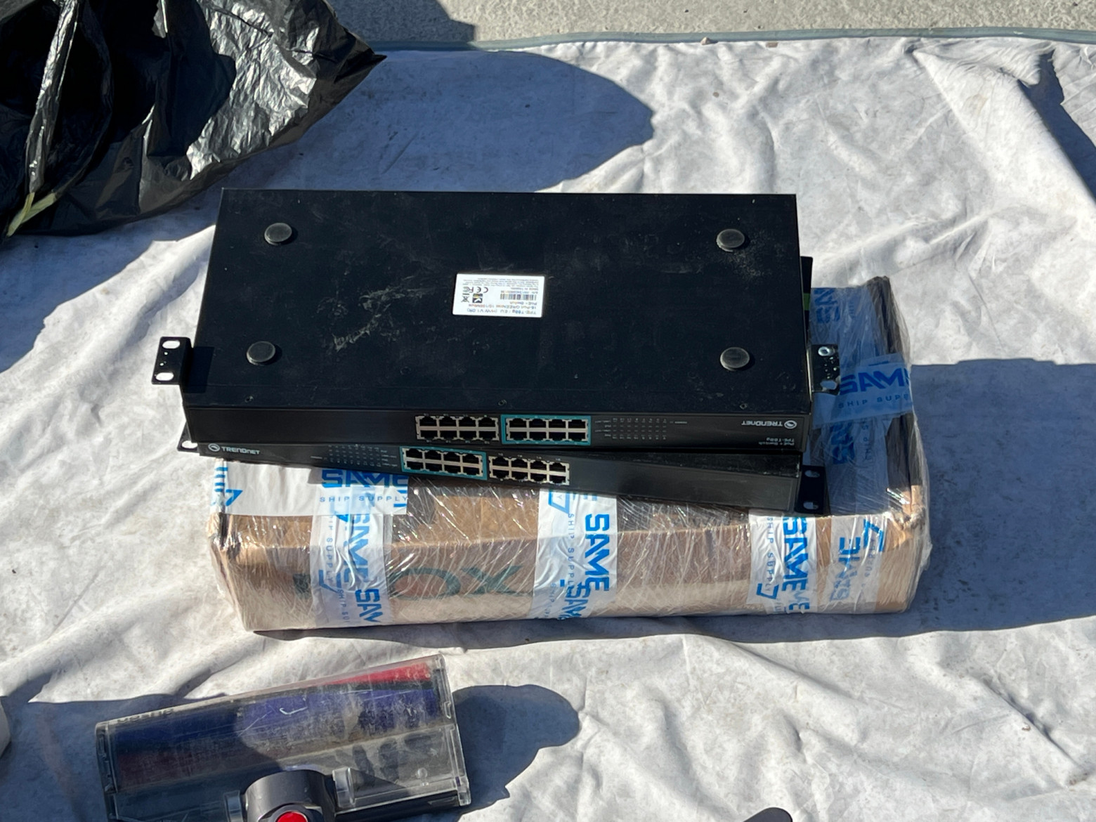 Два коммутатора (switch). Один из них обозначен как TRENDnet TPE-T88G / EU, это 16-портовый коммутатор стандарта Fast Ethernet (10/100 Мбит/с) с поддержкой технологии PoE+ (Power over Ethernet), которая позволяет питать подключенные устройства — например, IP-камеры, точки доступа Wi-Fi или телефоны — прямо по сетевому кабелю.