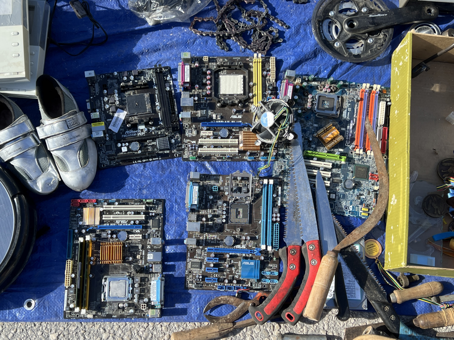Чуть дальше — несколько материнских плат для настольных ПК, в основном середины 2000-х — начала 2010-х годов. Видны платы от ASUS, Gigabyte и ASRock, рассчитанные на разные сокеты — от AMD AM2/AM3 и FM2 до Intel LGA775 и LGA1155. Большинство из них поддерживают память DDR2 или DDR3 и имеют классическую компоновку с слотами PCI, PCIe и разъемами SATA.