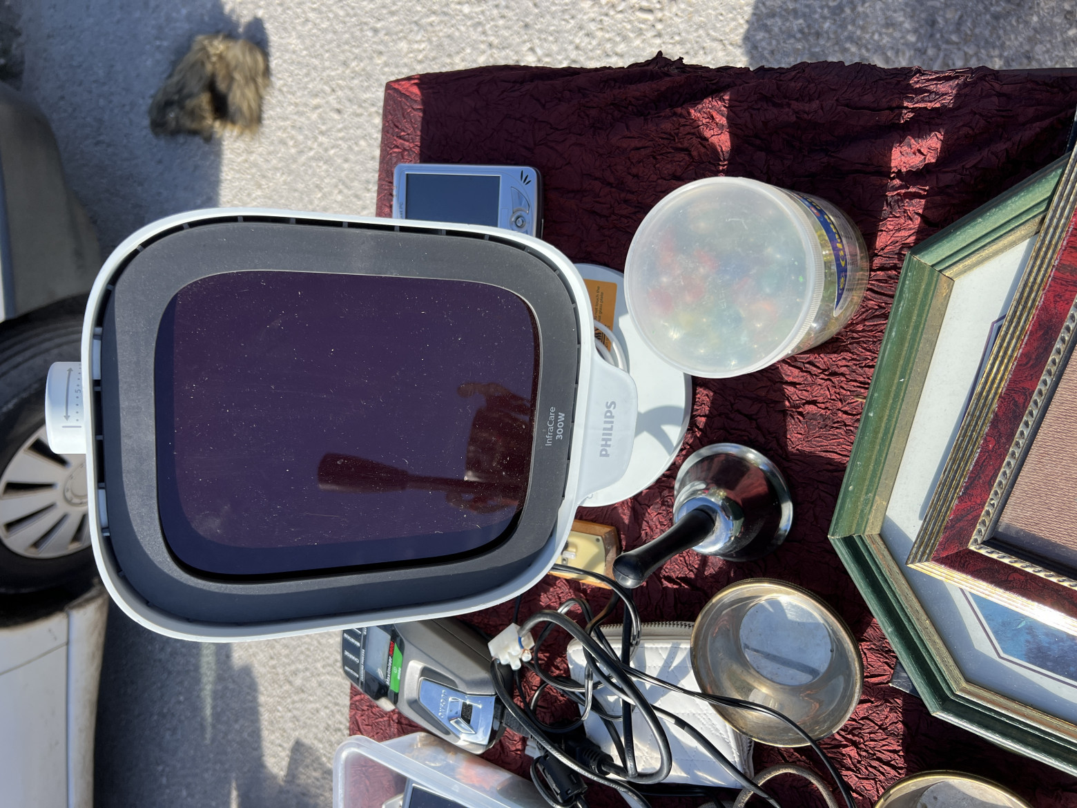 Тут у нас инфракрасная лампа Philips InfraCare мощностью 300 Вт, предназначенная для физиотерапевтического применения в домашних условиях. Она используется для локального прогрева мышц и суставов, улучшения кровообращения и снятия болевых ощущений при мышечных спазмах или простудных воспалениях. Лампа излучает мягкое инфракрасное тепло и часто применяется при лечении шейно-воротниковой зоны, спины или конечностей.