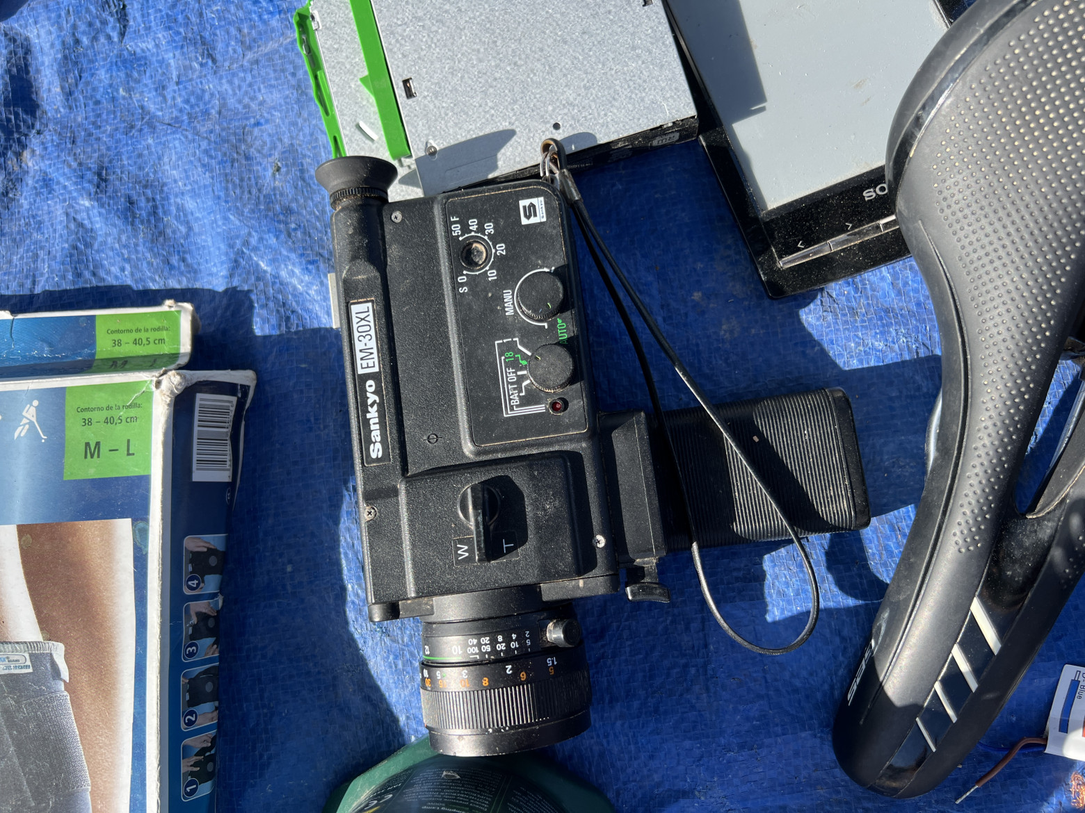 Попалась также винтажная камера. Это Sankyo EM-30XL, выпускавшаяся в конце 1970-х — начале 1980-х годов для формата Super 8. Это компактная любительская камера, использовавшая катриджи с 8-миллиметровой кинопленкой и оснащенная зум-объективом Sankyo Zoom Lens 1:1.2 f=8–48 мм. Камера позволяла снимать с ручной или автоматической экспозицией, имела управление скоростью кадра и питание от батареек, что делало ее популярной среди домашних видеолюбителей до появления бытовых видеокамер VHS.