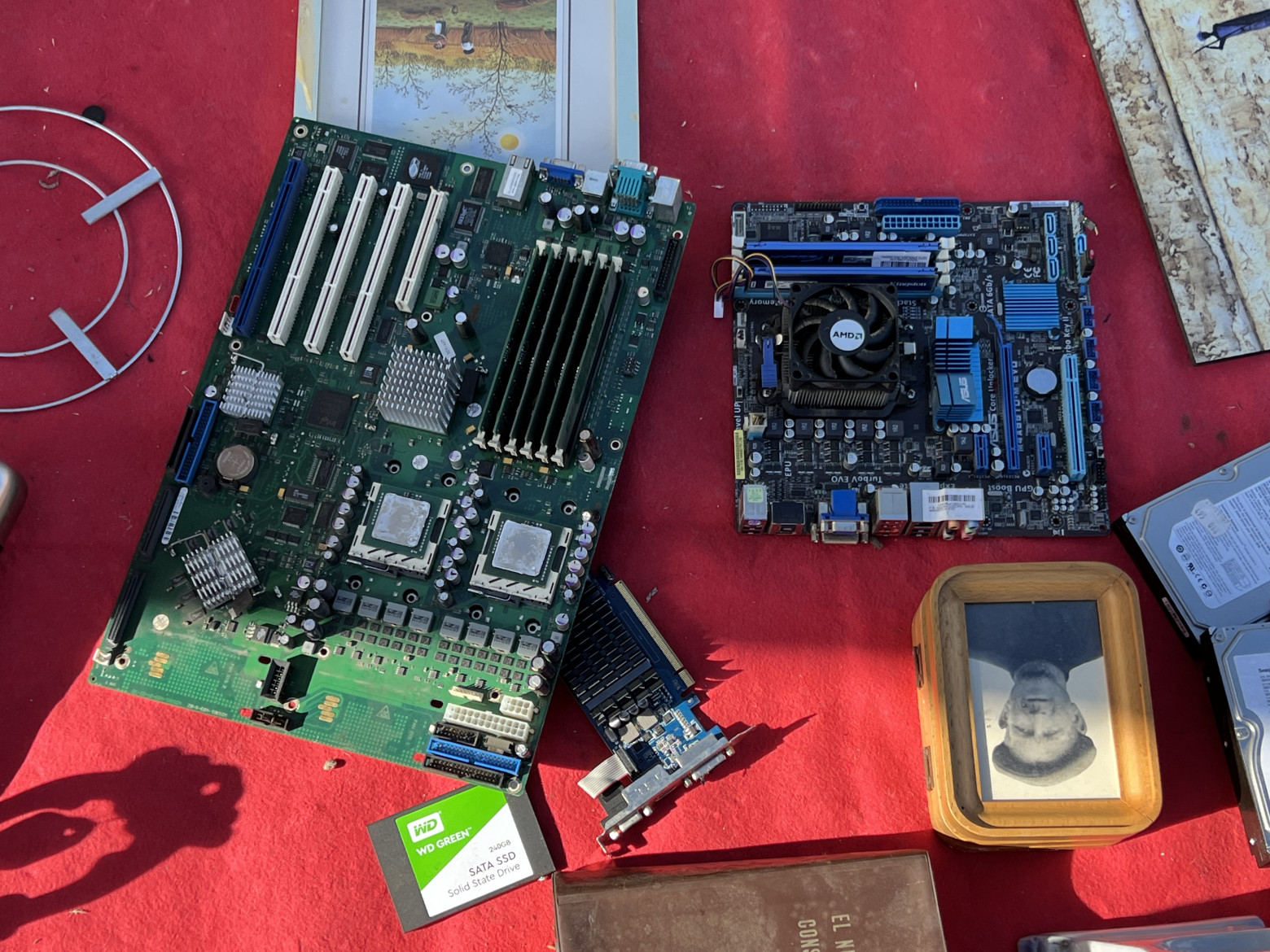 Отдохнули? Поехали дальше. Здесь две материнские платы: слева — стандартная настольная плата формата ATX от ASUS с процессором AMD и кулером, вероятно, из линейки M4A или аналогичной серии под сокет AM3; справа — серверная плата с двумя процессорными разъемами под Xeon, большим числом слотов памяти и PCI-слотов, предназначенная для рабочих станций или серверов 2000-х годов. Также виден SSD WD Green SATA. Ну и какой-то мужик на фотке.