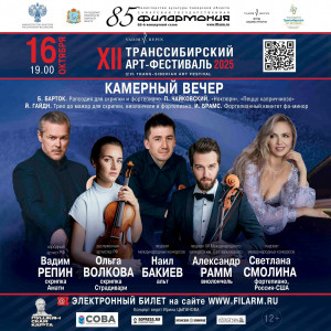 16 октября - Камерный вечер Транссибирского Арт-фестиваля 2025 в Самаре с участием народного артиста РФ Вадима Репина, заслуженной артистки РФ, концертмейстера оркестра Михайловского театра и оркестра musicAeterna Ольги Волковой (скрипка), лауреата XV Международного конкурса им. П.И.Чайковского Александра Рамма (виолончель), лауреатов международных конкурсов Светланы Смолиной (фортепиано, Россия-США) и Наила Бакиева (альт).