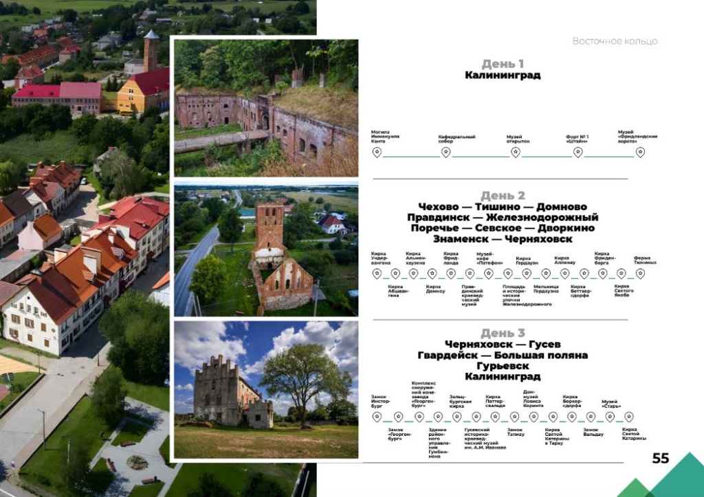 Во2-й деньпредлагают передвигаться преимущественно по Багратионовскому, Правдинскому и Черняховскому районам, а именно: Чехово – Тишино – Домново – Правдинск – Железнодорожный – Поречье – Севское – Дворкино – Знаменск – Черняховск.