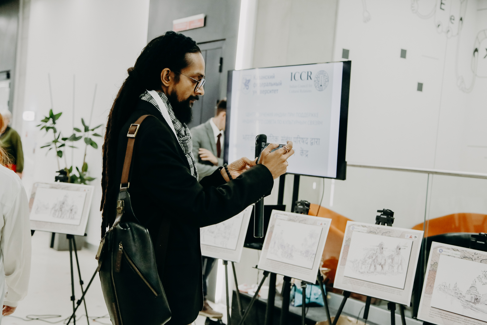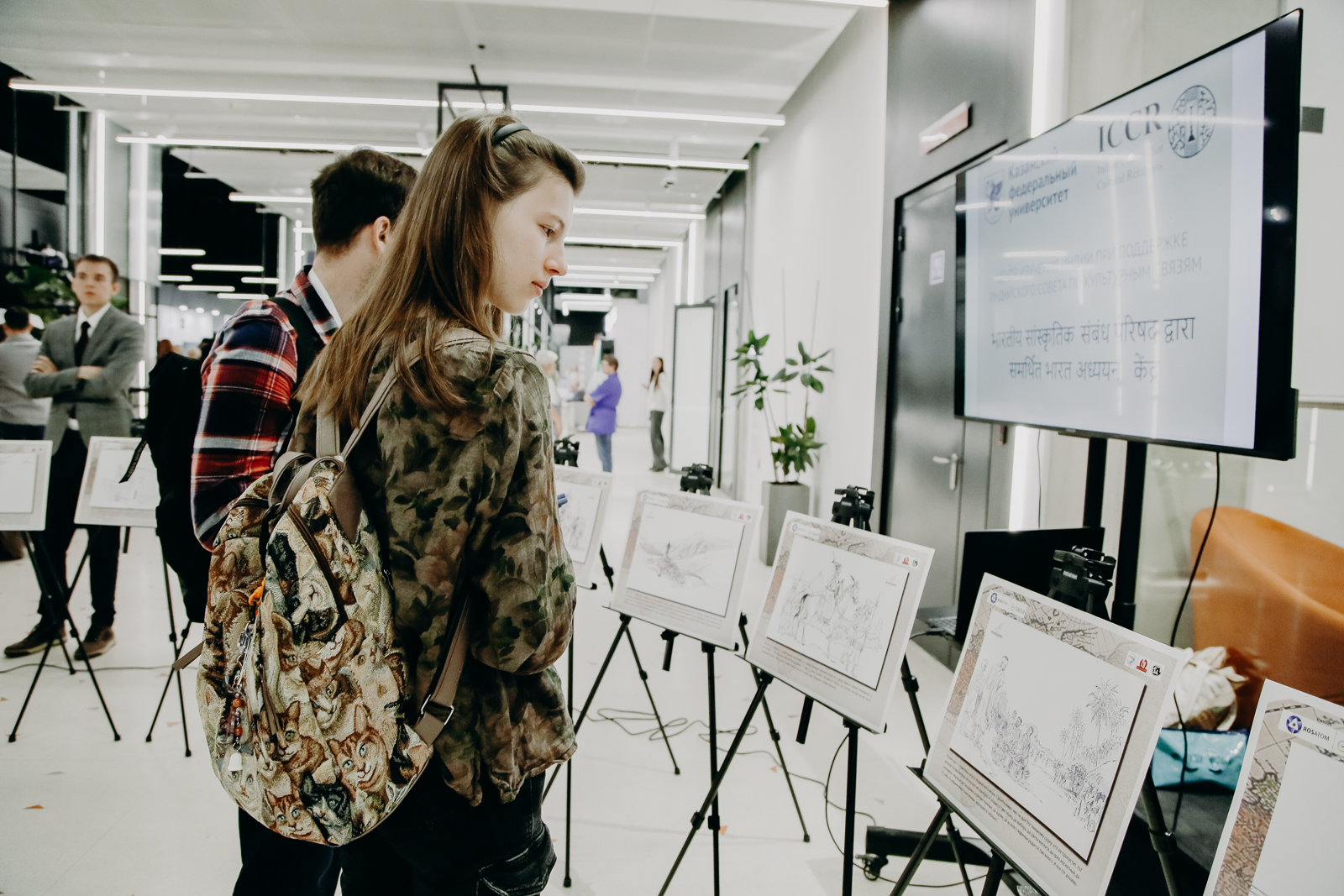 Отметим, что перед стартом пленарной сессии состоялся обход выставки, организованной в рамках события. На ней были представлены разработки и продукция предприятий регионов двух государств. Среди ее участников был и Центр изучения Индии ИМОИиВ с экспозицией «Хождение за три моря» – так называется памятник древнерусской литературы в форме путевых записей, сделанных Афанасием Никитиным во время его путешествия.