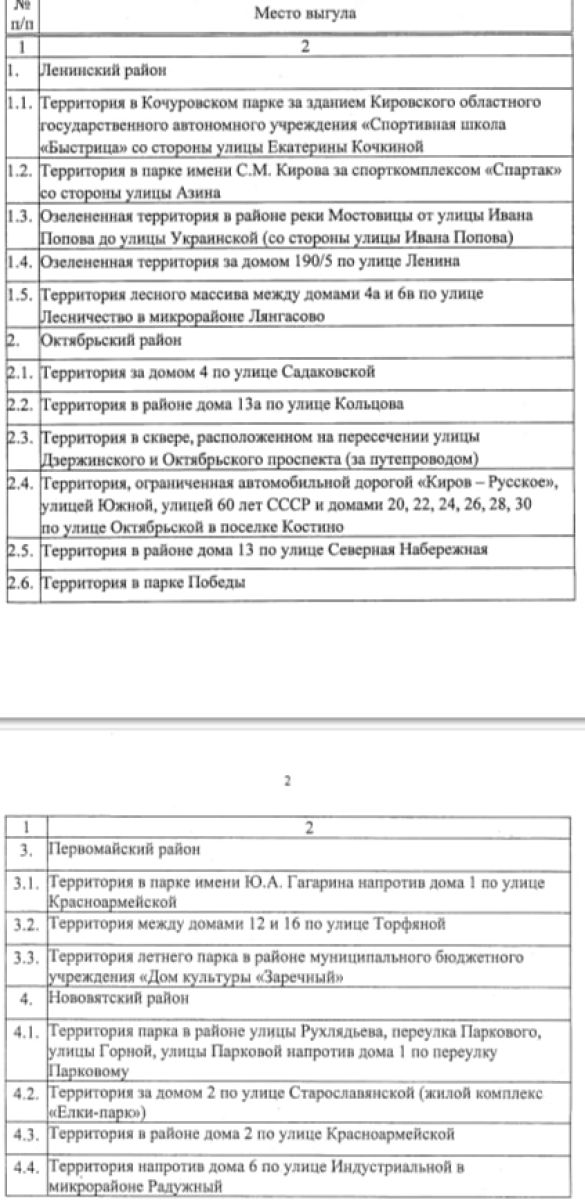 Согласно документу, в Ленинском районе города животных можно выгуливать в Кочуровском парке (за зданием спортшколы «Быстрица»), в парке им. Кирова (за спорткомплексом «Спартак»), в Первомайском районе – в парке им. Гагарина (напротив дома №1 по ул. Красноармейской),в Октябрьском районе – на территории в районе дома №13 на Северной набережной.