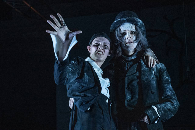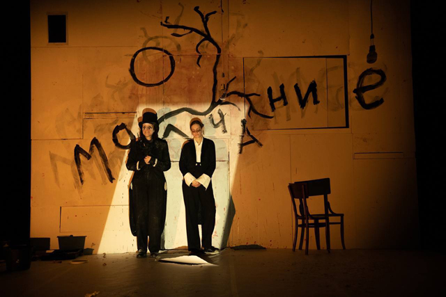 Все здесь дальше и будет забавной игрой, лишенной претензий на серьезное осмысление больных вопросов Достоевского. Две артистки, мать и дочь (что, впрочем, абсолютно несущественно для режиссерского решения Александра Церени), будут существовать в парном конферансе: угрюмый Закладчик и его мельтешащее суетящееся альтер эго. Первой в Ростовщика на наших глазах перевоплотится Ирина Савицкова: намажет лицо белилами, нацепит цилиндр поверх растрепанных черных волос до плеч и превратится в хмурую, почти гоголевскую фигуру. Чуть позже рядом с ней вырастет комикующий двойник — Ксения Галибина.