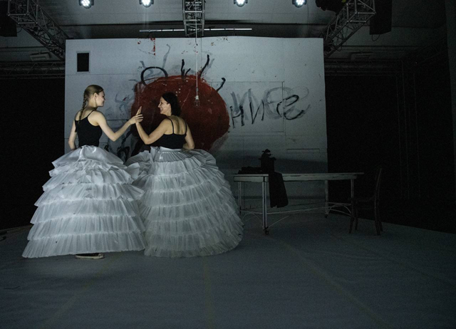 Оставаясь в рамках клоунских реприз, за которыми сложновато беспрерывно наблюдать полтора часа кряду, в финале А. Цереня прибегает к одной из излюбленных, а если говорить прямо, уже изрядно затертых режиссерских метафор: разлому декораций, уничтожению сценического пространства, обнажению «театра как такового». И артистки деловито разбирают стену на куски, сваливают в кучу разнообразный хлам, и сквозь обнаженный каркас в зрительный зал бьют те самые контровые фонари под веселенький хит Нины Симон «I’m going back home».