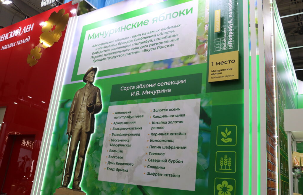 Тамбовская область представила павильон, посвященный Ивану Мичурину, великому селекционеру. В 2025 году исполняется 170 лет со дня его рождения. Мичуринск, город-наукоград, — общероссийский центр садоводства с научно-исследовательскими институтами и лабораториями. Многие популярные сорта яблок, груш и других плодов выведены именно здесь.