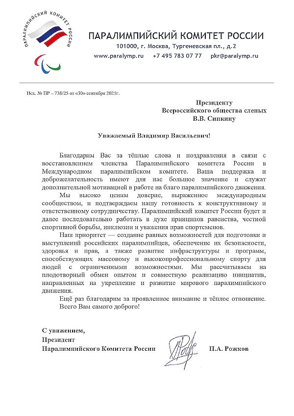 Мы высоко ценим доверие, выраженное международным сообществом, и подтверждаем нашу готовность к конструктивному и ответственному сотрудничеству. Паралимпийский комитет России будет и далее последовательно работать в духе принципов равенства, честной спортивной борьбы, инклюзии и уважения прав спортсменов.