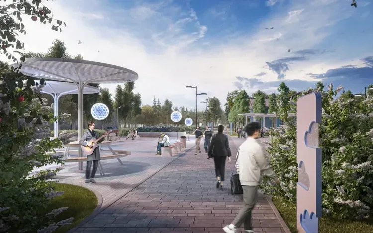 В основу стилистики проекта легли образы облаков, небесной синевы. Например, форму облаков будут иметь навес сцены, информационные стенды и арт-объекты. В виде самолетов сделают малые архитектурные формы для детей, канатный комплекс. На площади установят металлические скульптуры самолетов и местных птиц.