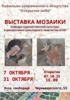 7 октября 2025 г. в Павильоне современного искусства «Открытое небо» Мемориальной библиотеки им. В.М. Башунова состоялось открытие выставки Мозаики студентов кафедры художественной культуры и декоративно-прикладного творчества Алтайского государственного института культуры.
