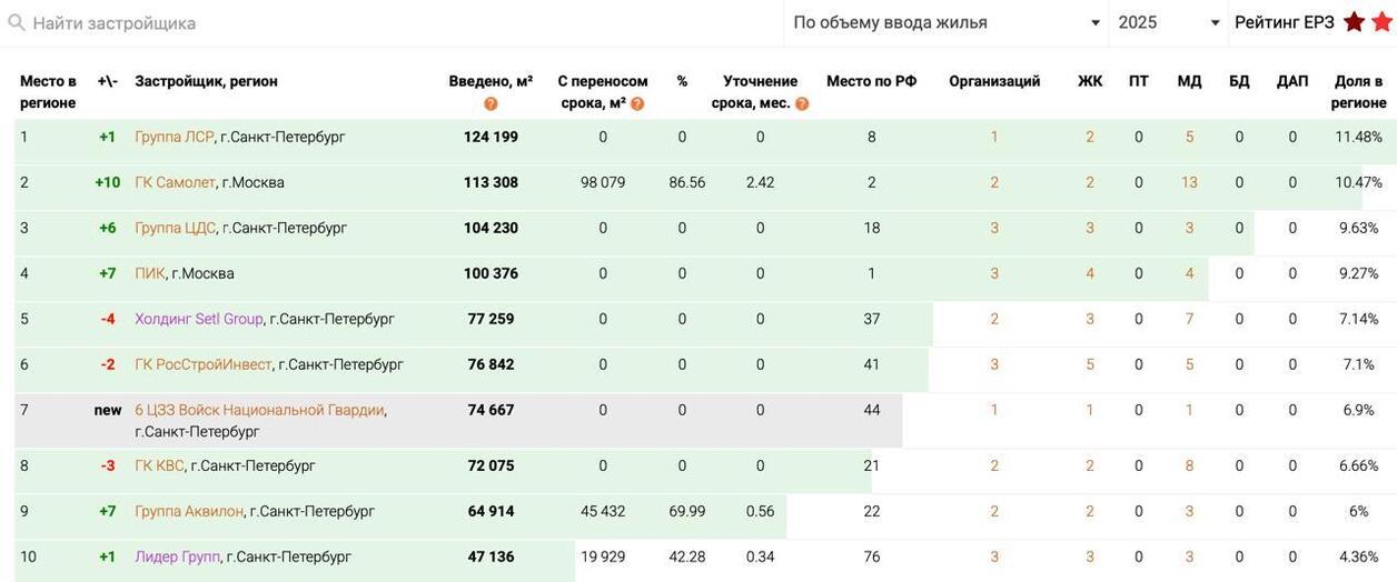 В топ-10 застройщиков по объему ввода жилья в городе за последние годы произошли существенные изменения. Согласно данным Единого ресурса застройщиков (ЕРЗ), на протяжении пяти лет Холдинг Setl Group стабильно удерживала вершину рейтинга по объему ввода жилья в Петербурге, а в 2025 году пальму первенства перехватила «Группа ЛСР», введя свыше 124 тысяч квадратных метров жилья и заняв 11,5% рынка. По данным портала «наш.дом.рф», холдинг Setl Group серьезно конкурировал и регулярно «обменивался» позицией лидера с «Группой ЛСР» и по объемам жилищного строительства.