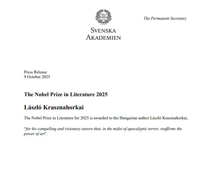 Шведская академия в Стокгольме объявила имя лауреата Нобелевской премии по литературе за 2025 год. Награду получил венгерский писатель Ласло Краснахоркаи«за его убедительные и визионерские произведения, утверждающие силу искусства посреди апокалиптического ужаса».