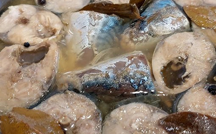Убавьте нагрев до минимума, накройте крышкой (можно чуть приоткрыть) и оставьте томиться на слабом огне 3 часа. Не перемешивайте во время варки — рыба должна сохранять форму. После окончания варки выключите нагрев и дайте рыбе полностью остыть прямо в кастрюле. Так она останется цельной и сочной.