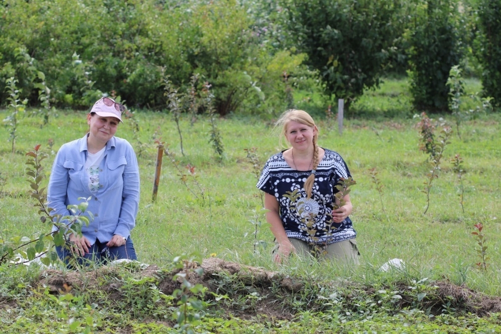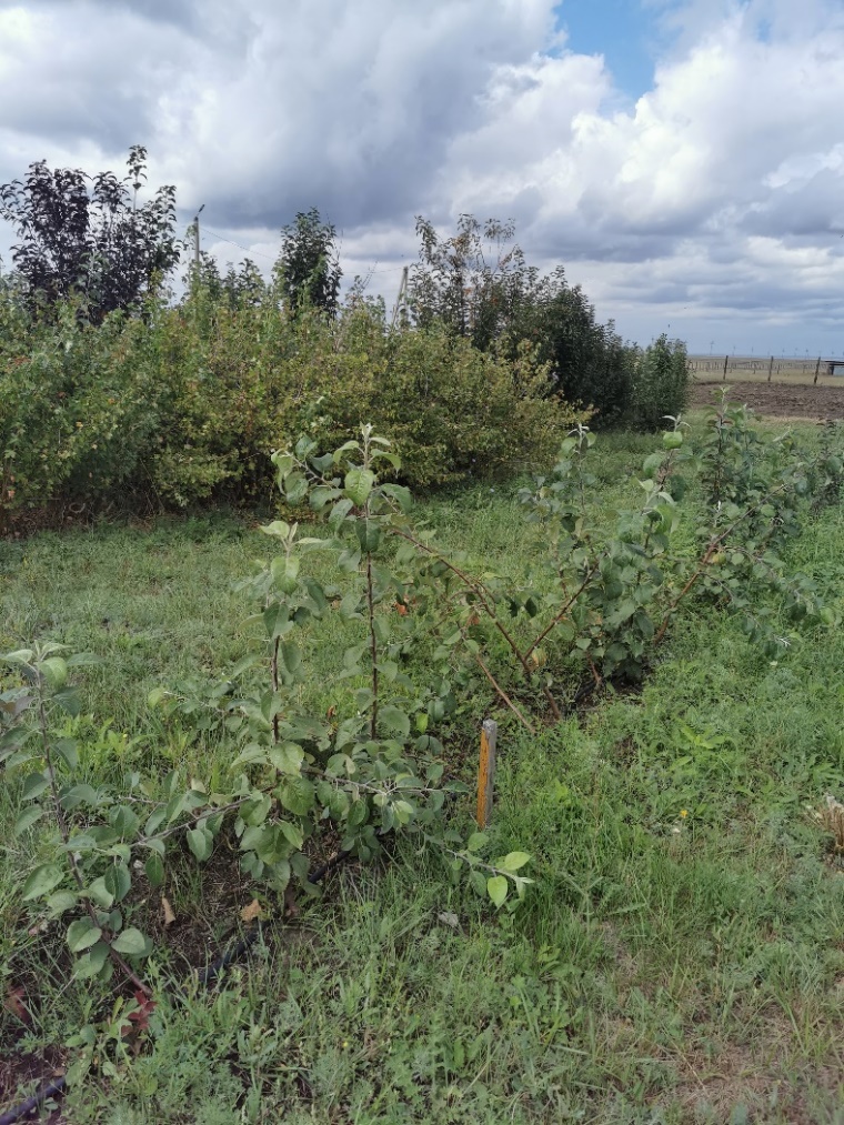 I опытный участок. Сад карликовых (стланцевых) форм яблони. Весной 2018 г. на стационаре были заложены подвоисорт Е-56. Схема посадки 5×2. Подвои были привиты по 10-12 растений стланцевыми сортми: Ковровое, Соколовское, Малиновое, Трудовое, Орское, Оренбургское позднее и другие. Данные сорта выведены Мазуниным М.А., Мережко О.Е. для зоны Южного Урала и лучше всего подходят для испытания на данной территории.
