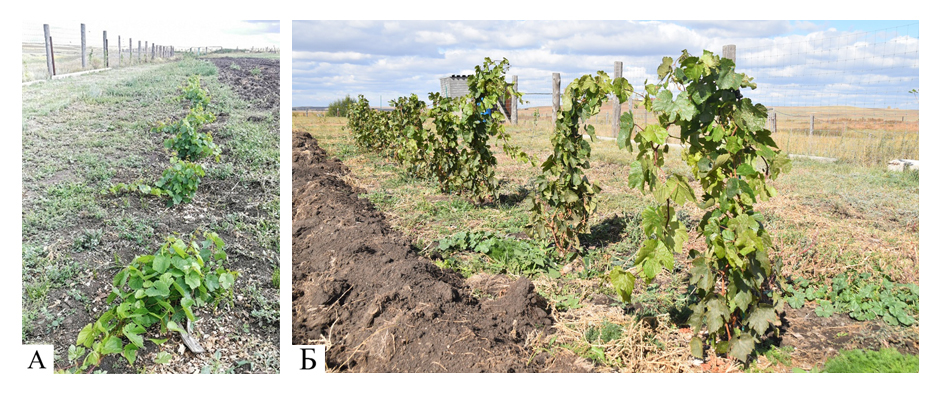 Рисунок 7 – Виноград сорт Память Домбковской. А) Июнь 2025 г.; Б) Сентябрь 2025 г.