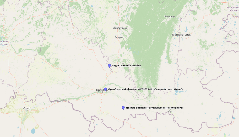 Рисунок 1.Схема расположения садов со стланцевыми (карликовыми) яблонями на территории Оренбургской области