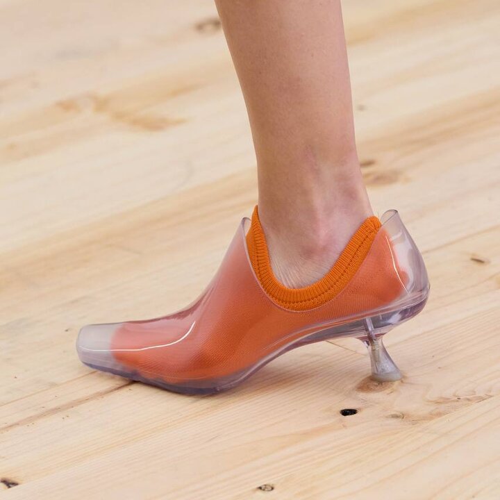 В прошлом году на фэшн-радарах засекли прозрачные гибриды босоножек и вьетнамок, появившиеся на шоу Chloe SS'25 (позже хит повторили Befree и Lime!). А в этом сезоне тренд на виниловую (и не только!) обувь разросся до остроносых калош-мутантов Loewe (сочетаем с трендовыми неоново-оранжевыми носками!) и пластиковых ретротуфель с контрастным каблуком Bottega Veneta. Джозеф Альтузарра в бренде имени себя сочинил пару из прозрачной сетки, а Чемена Камали в Сhloe и Алессандро Микеле в Valentino оставили пластмассовыми только перемычки на вьетнамках и сабо.