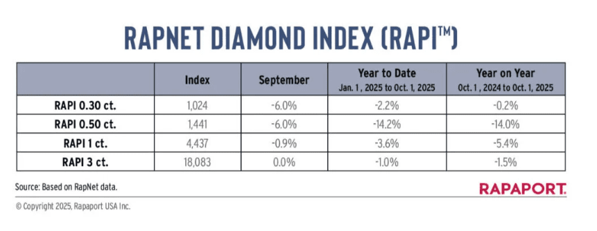 Согласно данным RapNet Diamond Index (RAPI), индекс для круглых бриллиантов весом 1 карат с характеристиками D–H и чистотой IF–VS2 снизился на 0,9% за месяц. Наиболее заметное падение зафиксировано в мелких категориях: стоимость камней весом 0,3 и 0,5 карата упала на 6%. Индекс для бриллиантов весом 3 карата остался без изменений.