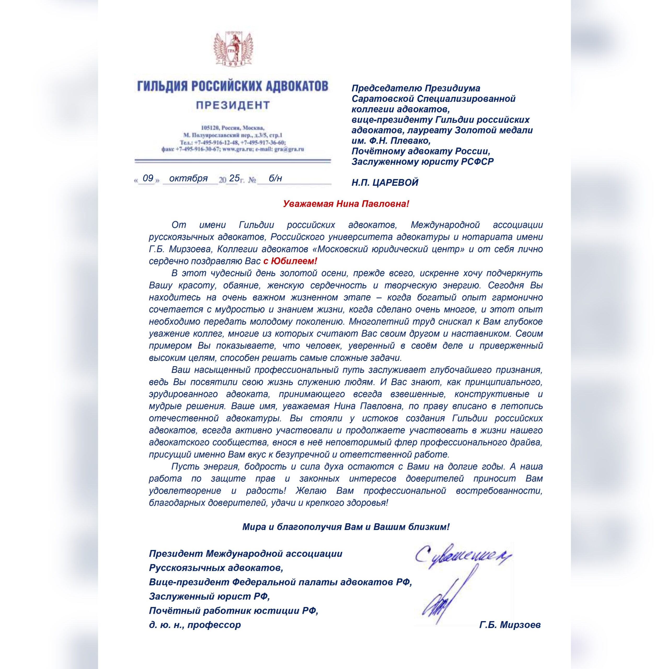 Президент Гильдии российских адвокатов, вице-президент ФПА РФ Г.Б. Мирзоев направил поздравительный адрес в связи с Юбилеем вице-президенту Гильдии российских адвокатов, председателю Президиума Саратовской Специализированной коллегии адвокатов, лауреату Золотой медали имени Ф.Н. Плевако, Почётному адвокату России, Заслуженному юристу РСФСР Нине Павловне Царевой.