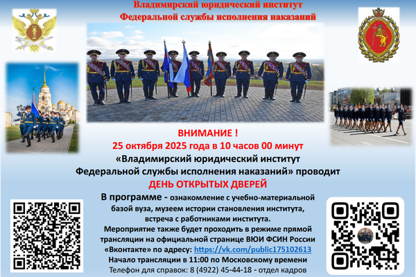 25 октября 2025 года в 10:00 во Владимирском юридическом институте Федеральной службы исполнения наказаний пройдет День открытых дверей!