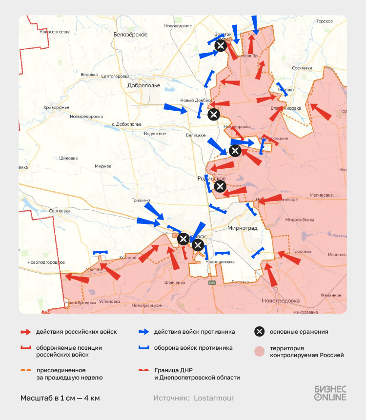 Основным событием недели остается сражение в районе Красноармейска (Покровска), а также добропольского выступа. Участок фронта крайне нестабильный, противник пытается проводить закрепляющие действия, российские части бьют по подходящим соединениям Киева, а линия фронта представляет собой условность, фактическое положение которой более чем формально.