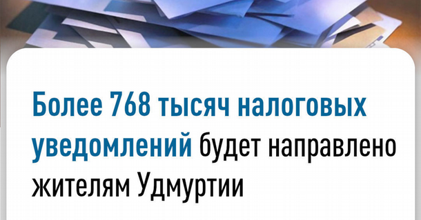 Управление Федеральной налоговой службы по Удмуртской Республике сообщает о начале рассылки налоговых уведомлений за 2024 год. Всего будет направлено 768 тысяч документов, из которых 508 тысяч – в электронном виде.