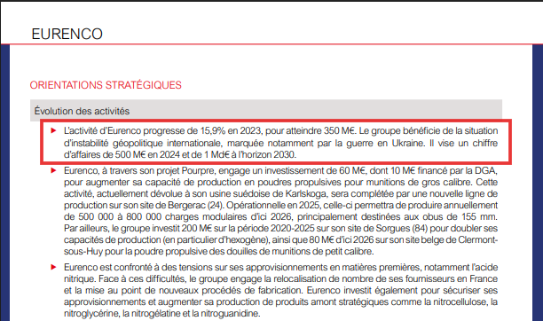 Среди ключевых направлений программы перевооружения Европы указаны боеприпасы, ракеты и артиллерия. Их производители во Франции показали резкий рост выручки. В Министерстве ВС Франции признают, что производитель боеприпасов Eurenco (принадлежит государству) «выигрывает от международной геополитической нестабильности, в частности от войны на Украине».