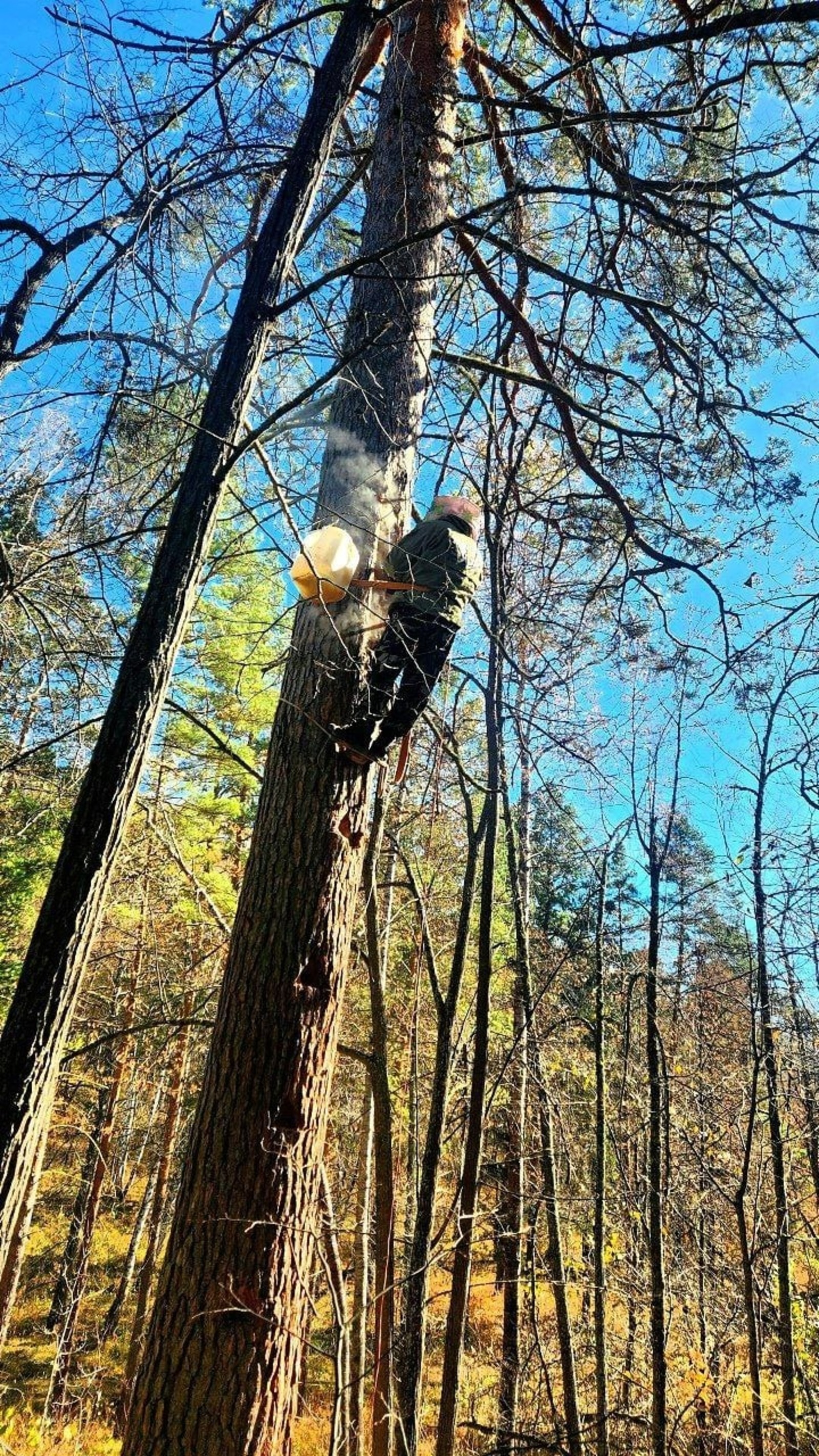 Закончив добычу, пчеловод тщательно проверяет состояние бортей, очищая их изнутри от накопившегося за летний сезон мусора и заменяя защитный слой свежей зеленью и ветками. Этот процесс помогает сохранить здоровье пчелиных семей и способствует повышению качества будущего урожая.