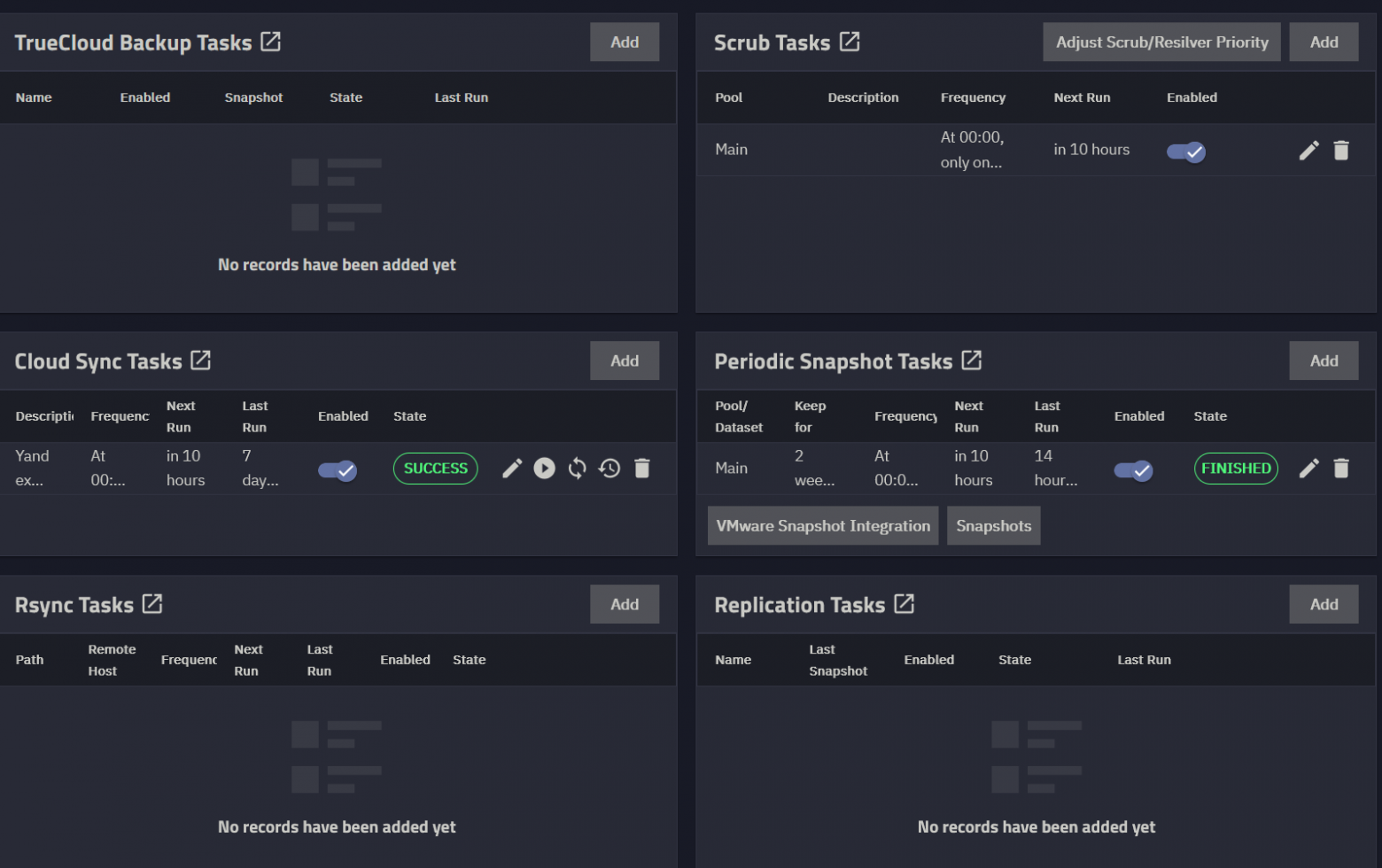 Данные терять очень не хочется, поэтому без резервного копирования никуда. Благо для этих целей в системе TrueNAS уже предусмотрены различные инструменты.