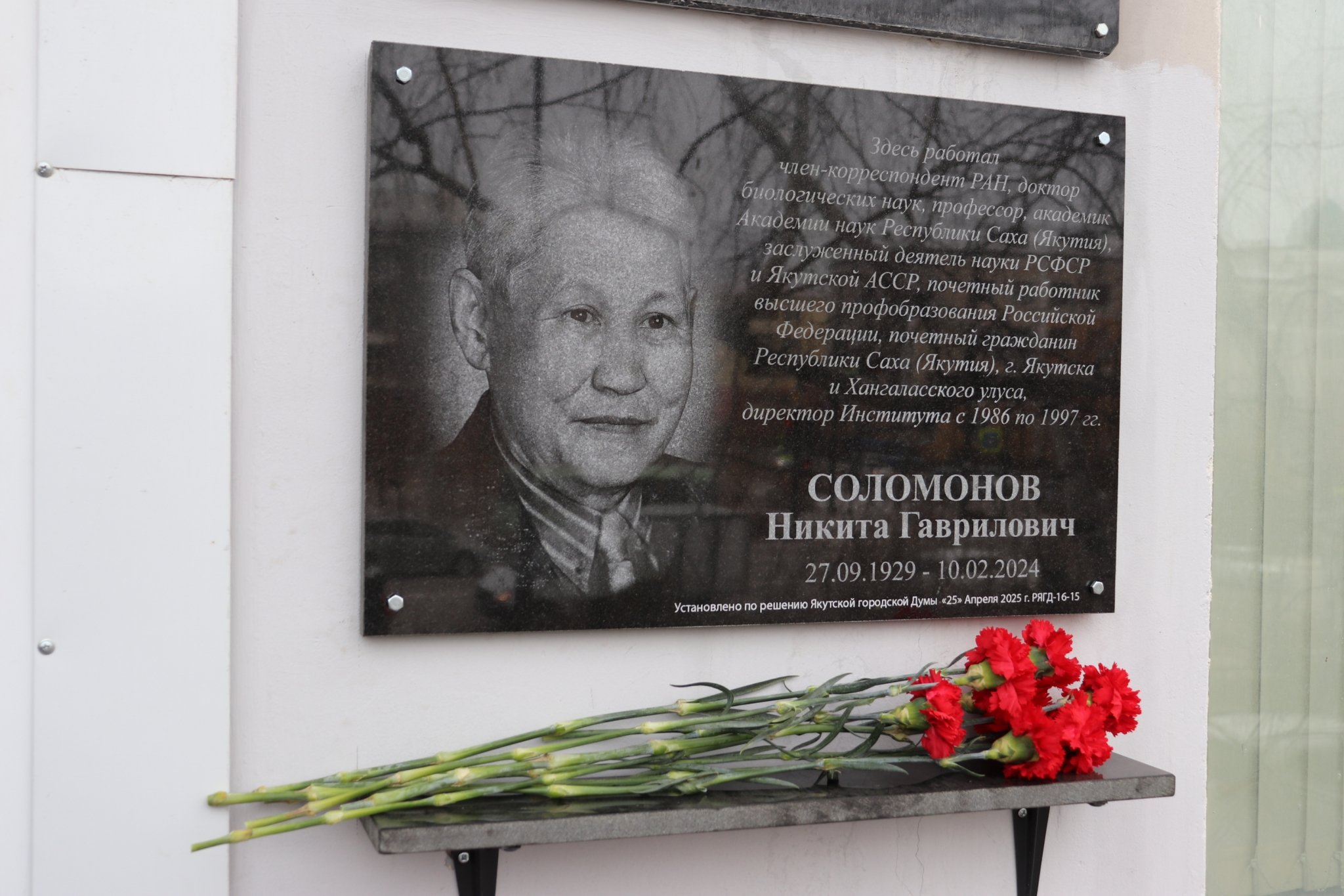 В Институте биологических проблем криолитозоны СО РАН — обособленном подразделении ФИЦ "Якутский научный центр СО РАН" состоялось торжественное открытие памятной доски, посвященной выдающемуся ученому, экологу и общественному деятелю, доктору биологических наук, профессору, академику АН РС(Я) Никите Гавриловичу Соломонову. Это событие стало значимым моментом в истории института и всего научного сообщества Якутии, увековечивая память о человеке, внесшем неоценимый вклад в развитие биологической науки в регионе и формирование экологического сознания общества. Более подробно в фоторепортаже ИМА YakutiaMedia.