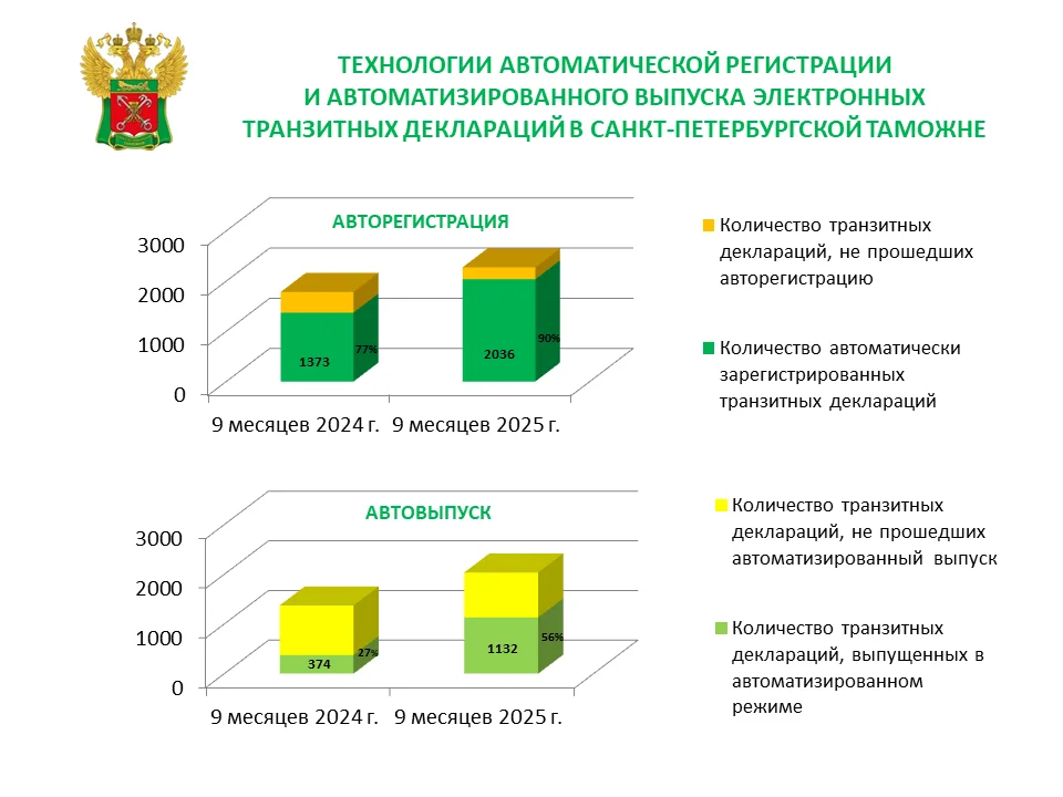 Количество транзитных деклараций, выпущенных в автоматизированном режиме, за 9 месяцев 2025 года увеличилось в 3 раза и составило 1132 ЭТД – 56 % от общего количества транзитных деклараций, по которым проводилась проверка на возможность автоматизированного выпуска.