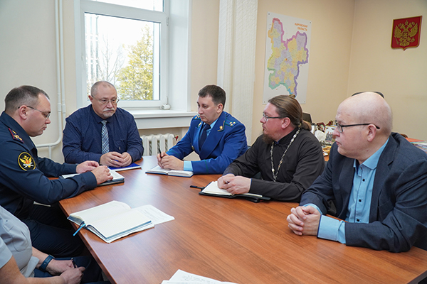 В Кировской области состоялась рабочая встреча Уполномоченного по правам человека Александра Панова с руководителем пенитенциарного ведомства Кириллом Поповым. В мероприятии также приняли участие начальник отдела по надзору за соблюдением законов при исполнении уголовных наказаний прокуратуры Кировской области Никита Ватулин, председатель Общественной наблюдательной комиссии Владимир Путинцев и председатель Общественного совета при УФСИН России по Кировской области Сергей Носков.