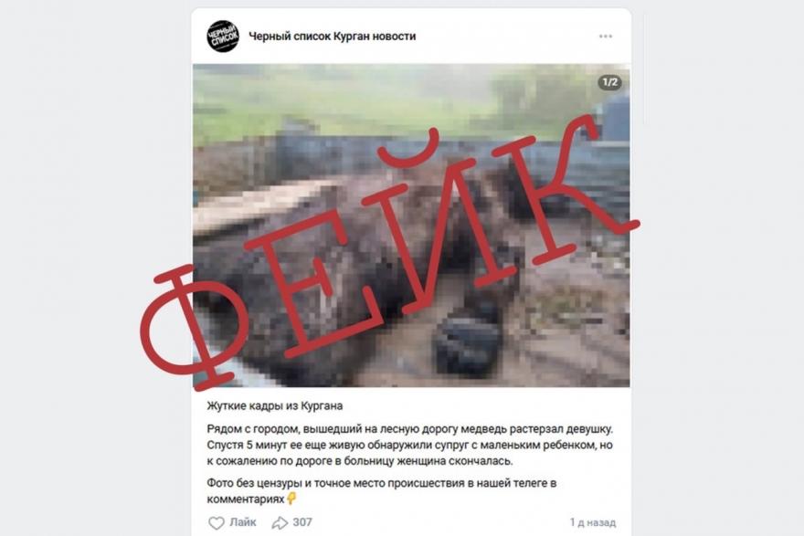 В сообществе «Черный список. Курган новости» в социальной сети «ВКонтакте» появился пост с фотографией якобы жертвы медведя. Авторы поста утверждают, что дикое животное напало на девушку на лесной дороге возле Кургана. Пострадавшая, заявляют в публикации, скончалась.