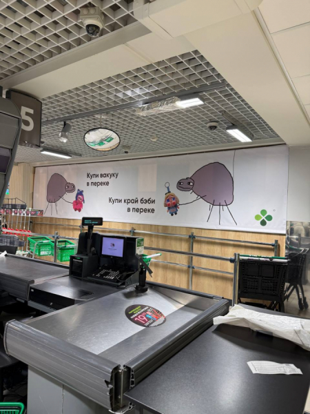 В одном из магазинов «Перекрёстка» появился баннер с забавными пауками, которые обсуждают покупку новинок — игрушек «Вакуку» и «Край Бэби». Легкий и визуально яркий формат сразу обращает на себя внимание посетителей, превращая обычное сообщение о товаре в юмористическую сценку. Такой прием показывает, как мемы могут стать инструментом нативного маркетинга и сделать промо более заметным и запоминающимся.