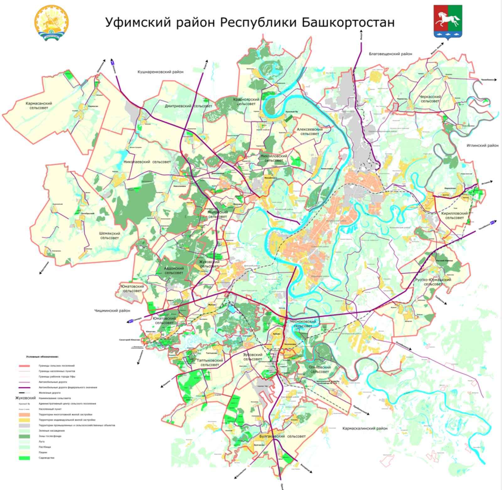 Его судьба тесно связана с историей нашего края и с возникновением Уфы как города-крепости, становлением ее как столицы региона. Особенностью района также является его географическое положение вокруг экономического и политического центра республики. Его территория не раз становилась ареной крупных исторических событий. Жители района бережно хранят память о Крестьянской войне под руководством Емельяна Пугачева, один из штабов которого находился в селе Чесноковка. В гуще событий оказался район и в годы Гражданской войны. Во время Великой Отечественной здесь формировалась легендарная 112-я Башкирская кавалерийская дивизия под командованием генерала Минигали Шаймуратова. Поэтому центральной фигурой герба района выбран скачущий серебряный конь – как народная память об историческом прошлом и символ устремленности в будущее.