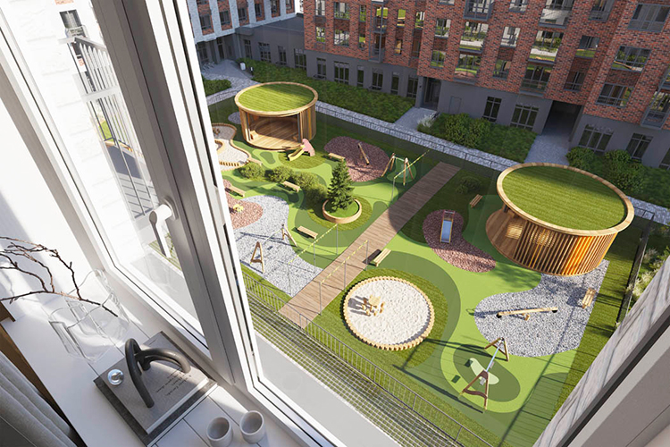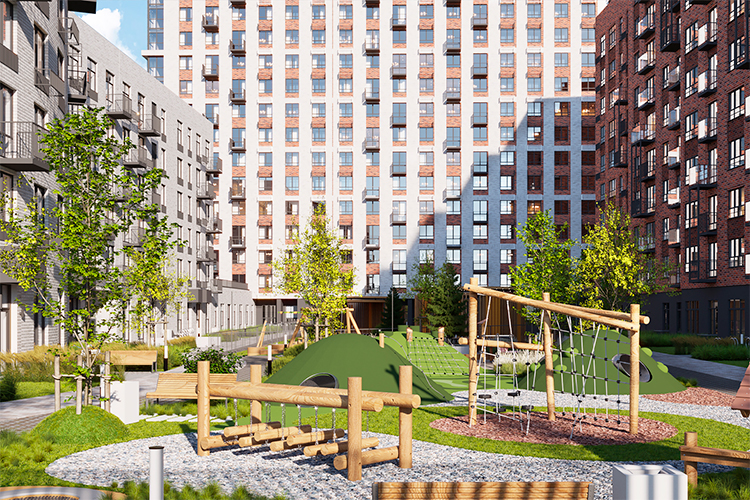 Во дворе нет машин — только пространство для жизни: деревянные качели, пешеходные тропинки, тихие уголки и вечернее освещение, которое превращает прогулку в маленький ритуал. На первых этажах разместятся уютные кафе, студии, магазины — все, что создает ощущение «своего» квартала.