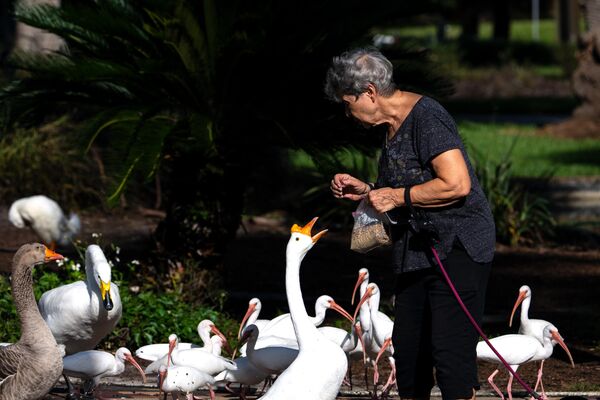 Гусь возмущённо кричит в то время, как женщина кормит других птиц в парке Лейк-Эола в Орландо, штат Флорида, США.
